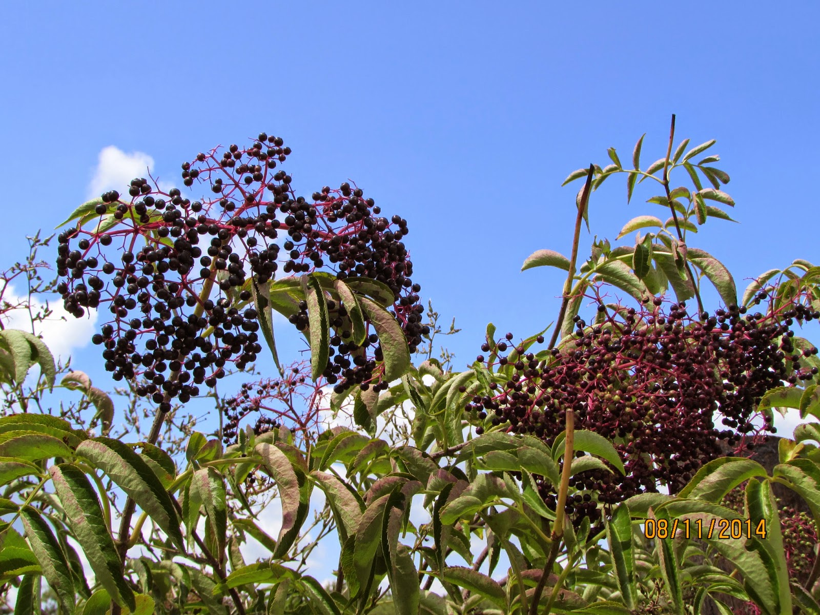 Pick your elderberries heads. The berries don't ripen all at once, so you will have about a month to keep picking as they ripen. This is actually great. When the heads ripen, snap them off and into a plastic grocery sack. Shove the sack in the freezer. Next round of berries ripens, repeat. They will keep like that for months, so you could wait until cool weather- November, December- to do your juicing and jellying.