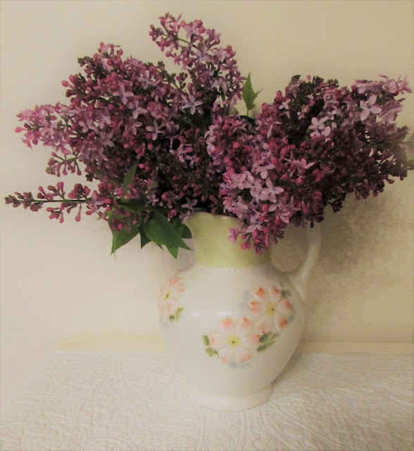 As my flowerbeds go through the seasons my tables sport an ever-changing array of what is most beautiful at the moment. They are rarely arranged, just stuffed, all of one kind, in whatever container is handy at the moment. I really favor the old bottles that my boys have found on the farm over the years.