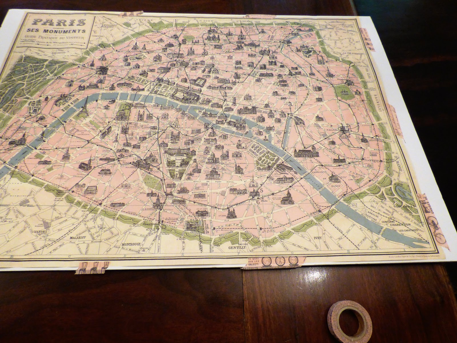 Once I had it situated to my liking, I removed the tape at one end, sprayed with glue and smoothed it down. When that was set, I could take off all the other tape because the map would no longer shift. Then I sprayed the rest of the map and smoothed out carefully.