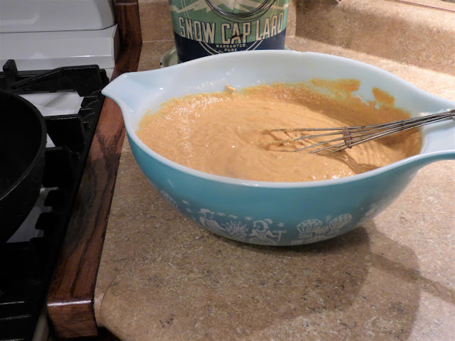 The next morning all I had to do was heat the skillet and combine the two bowls to make a beautiful orange-y pumpkin batter. I cook my bacon in the oven to save on time and spatters. I lay the slices on a rimmed cookie sheet (to catch the grease) and then place it into a cold oven and turn the oven on 400 degrees. I rotate the pan after 10 minutes, and begin to check the slices for doneness after about 7 more minutes. I have our butcher cut our bacon nice and thick, so store-bought thin slices will take much less time.When you pour the batter into the pan, you may need to use the edge of the cup to spread the thick batter into a circle. Then use the last bit in the cup to pour upwards into a stem shape. This takes all of one second and is non-negotiable when making pumpkin pancakes. Just do it. (The syrup is staying warm in it's little pitcher on the back of the stove.)
