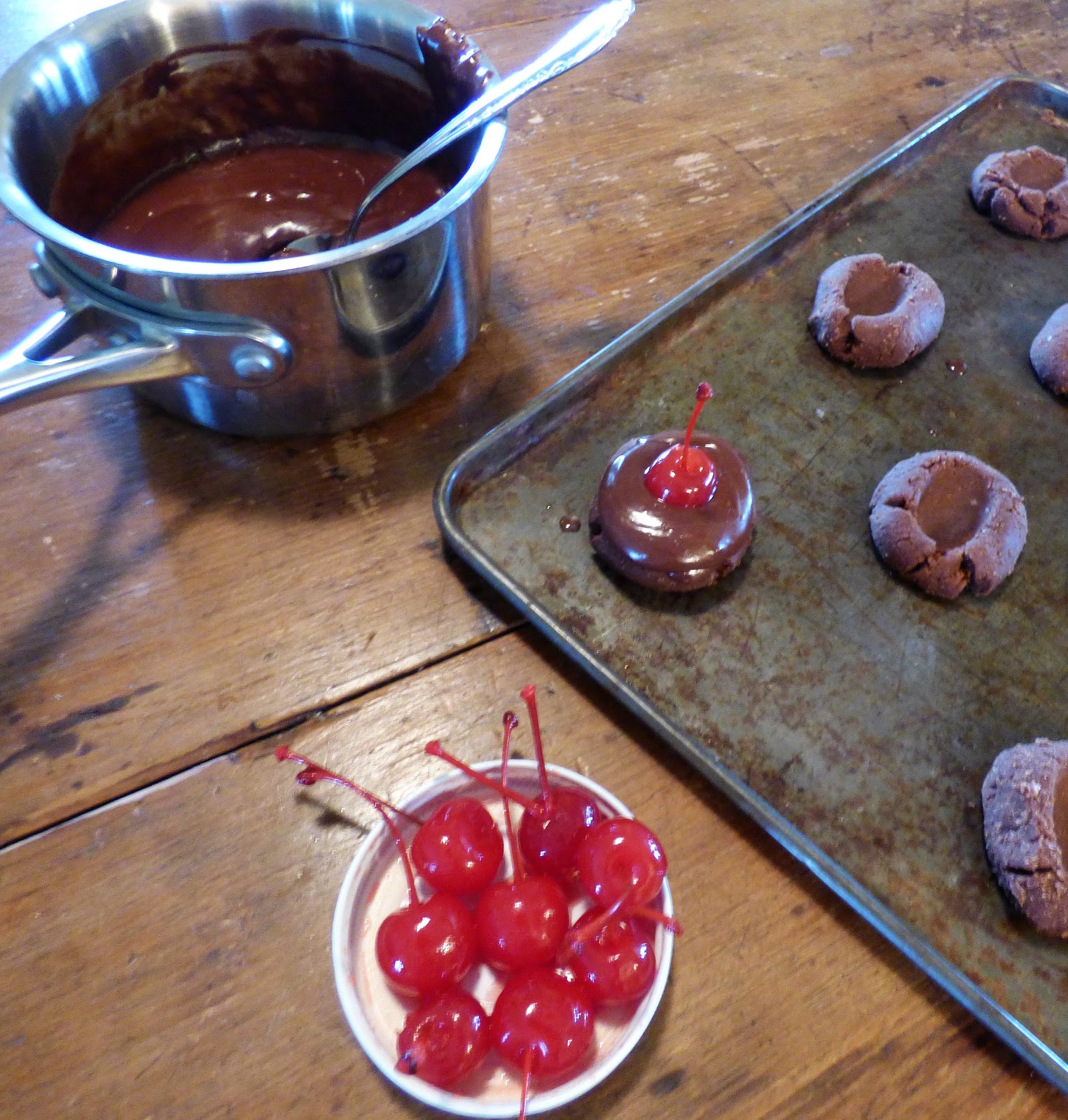 Place the balls on an ungreased cookie sheet. Use your thumb to make a divot to hold the cherry. I have big fingers! For a child they may need to make two prints on each cookie.